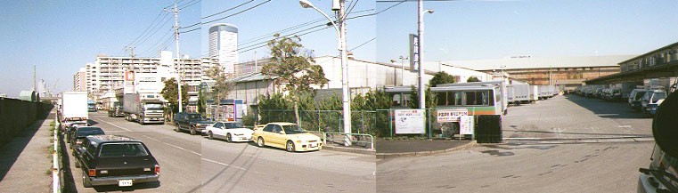 【線路は写真左中あたりから道路を斜めに横切り、プレハブ後の建物沿いにカーブし、